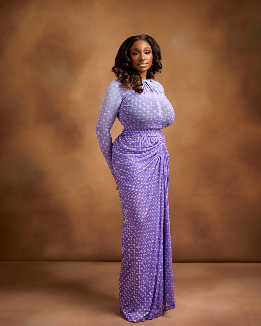 Soft. Elegant. Intentionally feminine. From ‘To The Woman” Edit, the Naya Set is a beautifully sculpted two-piece ensemble designed to celebrate the strength and softness of the modern woman. Crafted in our signature palm tree lavender print, this set features a fitted long-sleeve top paired with a gracefully draped ruched skirt. Refined yet striking, the Naya Set is perfect for special occasions, dinners, or moments when you simply want to embody effortless grace.