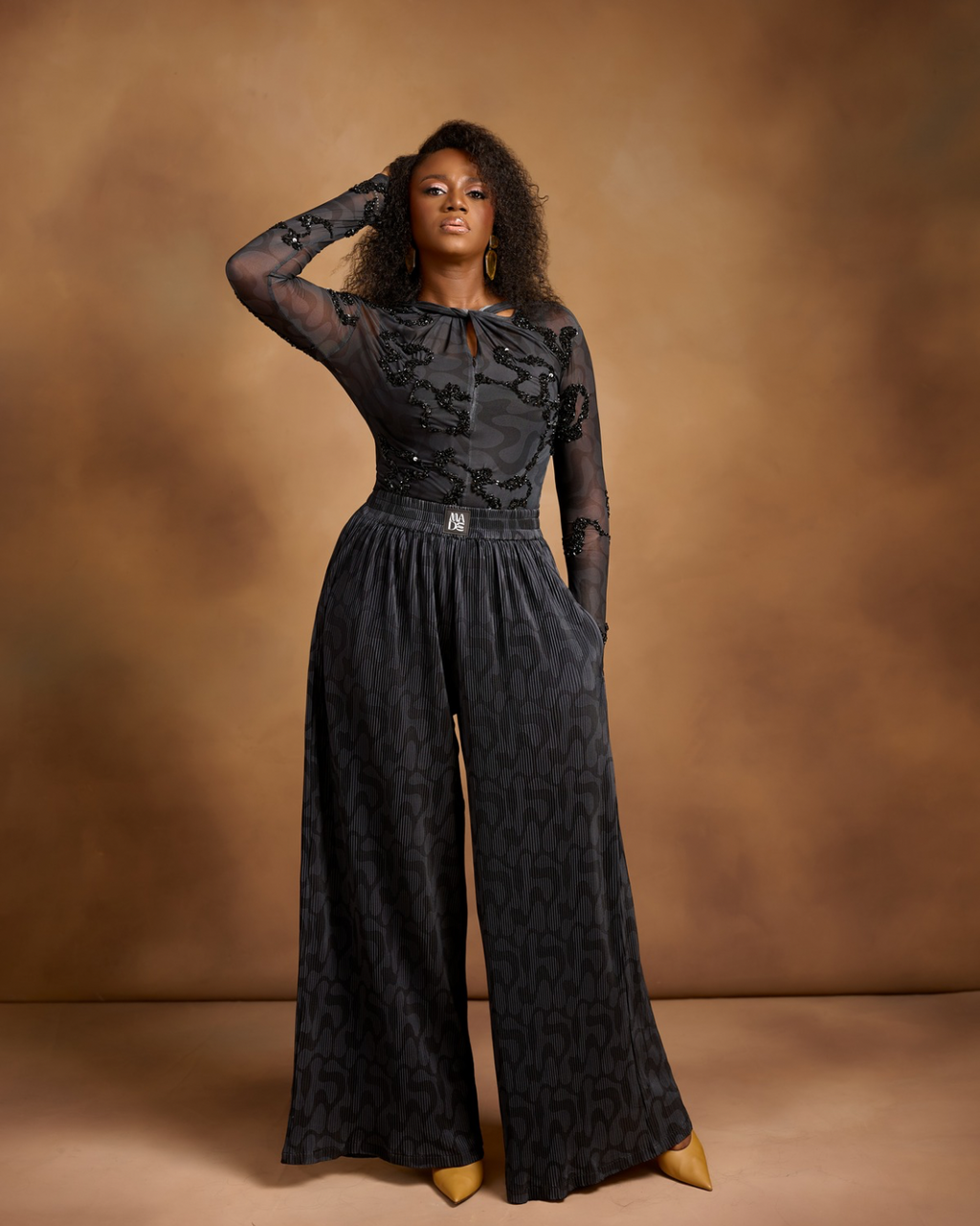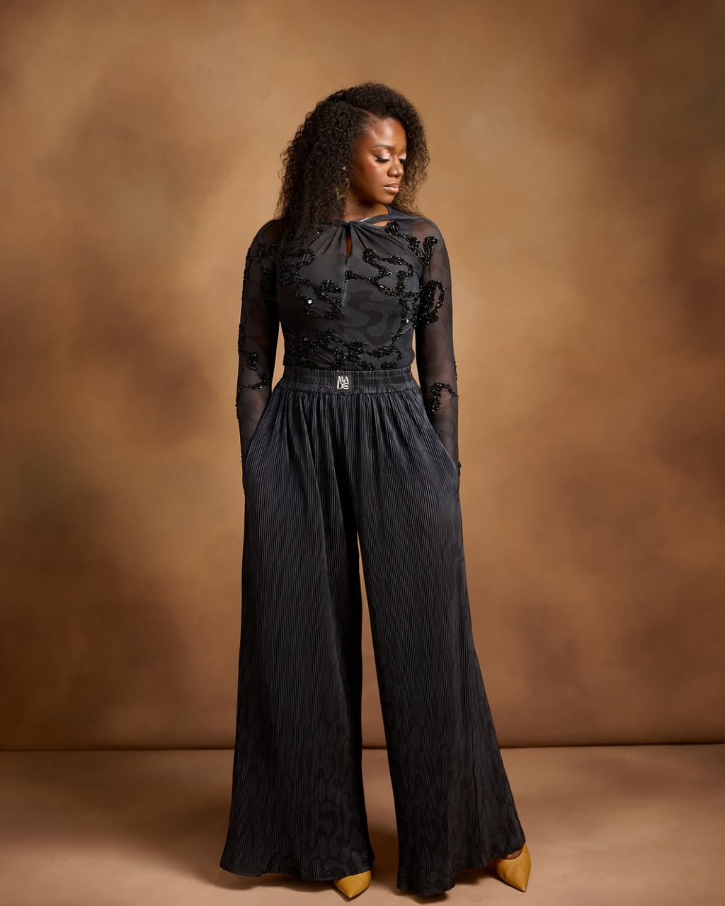 Designed in our signature Ara Print, The Nova Set is a statement of refined strength and effortless sophistication. Featuring a sheer embellished long-sleeve top paired with flowing wide-leg trousers, the silhouette balances delicate detail with confident structure. Part of the TO THE WOMAN collection, the Nova Set reflects the woman who carries her strength with quiet confidence, the one who walks into every room fully aware of who she is. Timeless, expressive, and powerful, it is a piece designed for moments when presence speaks louder than words.